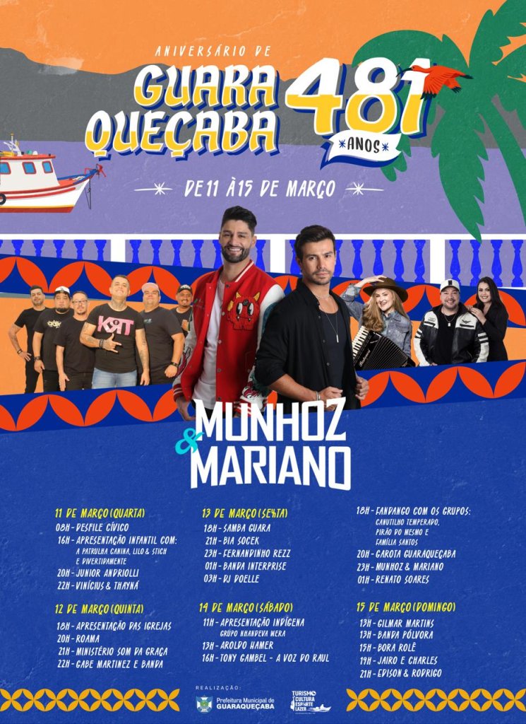 A Prefeitura de Guaraqueçaba divulgou a programação oficial das comemorações pelos 481 anos do município, que serão celebrados entre os dias 11 e 15 de março, com diversas atividades esportivas, culturais e apresentações musicais abertas à população.