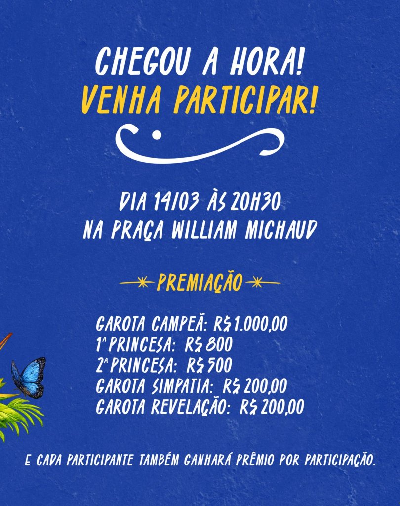 O tradicional concurso Garota Guaraqueçaba 2026 será realizado no dia 14 de março, às 20h30, na Praça William Michaud.